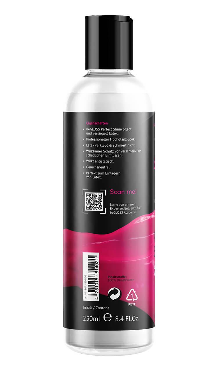 beGLOSS PERFECT SHINE - Perfect Shine & Sensitive Care - Optimaler und professioneller Hochglanz - Latexlook und schonende Pflege. Das Silicon Latex ÖL, die Hochglanz Pflege Politur, verleiht Gummi & Latex Kleidung einen hochglänzenden Latex Look. Die perfekte Hochglanz Veredelung für Gummi & Latex Kleidung.